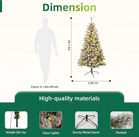 6FT Pre-Lit Snow Flocked Christmas Tree with 300 Warm White LED Lights, 575 PVC Branch Tips, Fake Xmas Snowy Trees,Pre-Hinged & Foldable Base for for Indoor, Office, Party, Holiday Décor