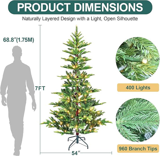 7FT Prelit Artificial Christmas Tree, Premium Douglas Fir Christmas Tree with 400 Warm White Lights & 960 Branch Tips, PE & PVC Pre Lit Hinged Xmas Trees with Metal Base for Party, Holiday Decoration