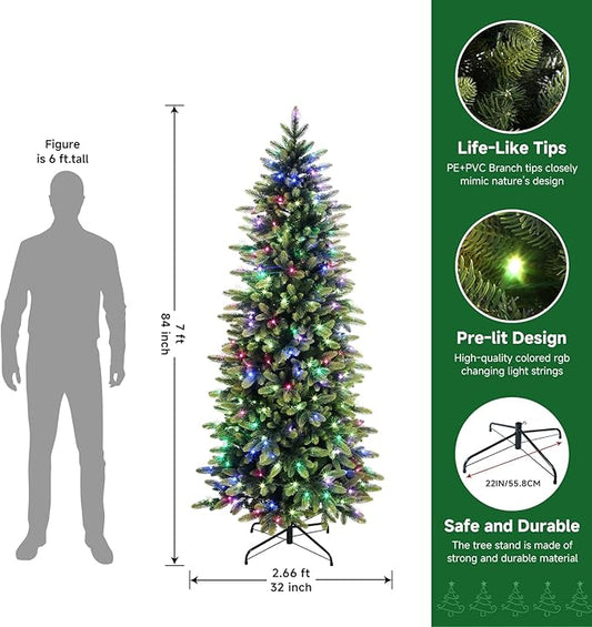 Alupssuc 7ft Prelit Artificial Hinged Pencil Christmas Tree with 330 Multi-Color Changing RGB Lights and 1809 PE & PVC Branch Tips, Remote Control 7 Feet Pre-Lit Slim Tree for Xmas Decoration, Green