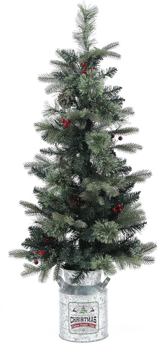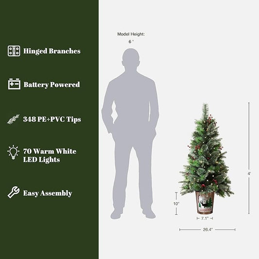 LuxenHome 4FT Small Christmas Tree, Battery Operated Potted Christmas Trees with 70 Warm White LED Lights, Slim Xmas Tree with Red Berries and Metal Pot for Entryway, Livingroom Holiday Display
