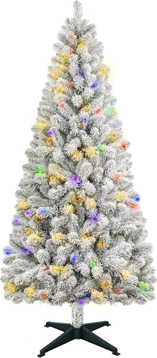 6.5ft White Flocked Christmas Tree with Lights – Pre Lit Flocked Christmas Tree with 250 Multi-Color LEDs, 600 Tips, Pedal Control, Hinged Full Flocked Tree with Plastic Stand