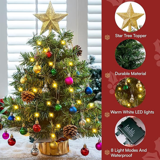Joiedomi 24"/2FT Tabletop Mini Christmas Tree Pre lit with Warm Lights, Holly Berries, Pine Cones and Ornaments for Indoor Artificial Mini Xmas Tree Holiday Season Decorations (Gold)