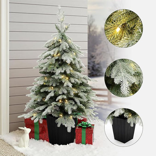 LuxenHome 5FT Small Christmas Tree, Potted Slim Christmas Tree with 100 Warm White LED Lights, Realistic Cedar Prelit Artificial Christmas Trees with Black Planter Pot for Outdoor Porch, Entryway