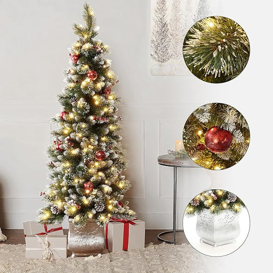 LuxenHome 5FT Potted Christmas Tree with Ornaments, Pre-Decorated Small Flocked Artificial Christmas Trees Prelit with 150 LED Lights, Pencil Xmas Tree with Pot for Indoor, Outdoor