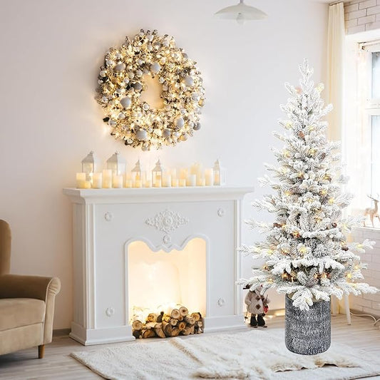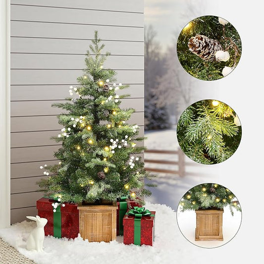 LuxenHome 4FT Potted Flocked Christmas Tree, Small Christmas Tree Prelit with 70 Warm White LED Lights, Berries and Pine Cones, Lighted Pencil Artificial Christmas Trees with Planter Indoor & Outdoor