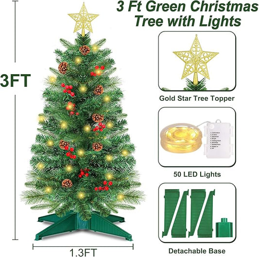 3 Ft Green Christmas Tree with Lights, Timer 8 Modes DIY 50 Warm White Lights Battery Operated Small Artifical Full Xmas Tree Pine Needles Cones Red Berry for Tabletop Home Indoor Holiday Party Decor