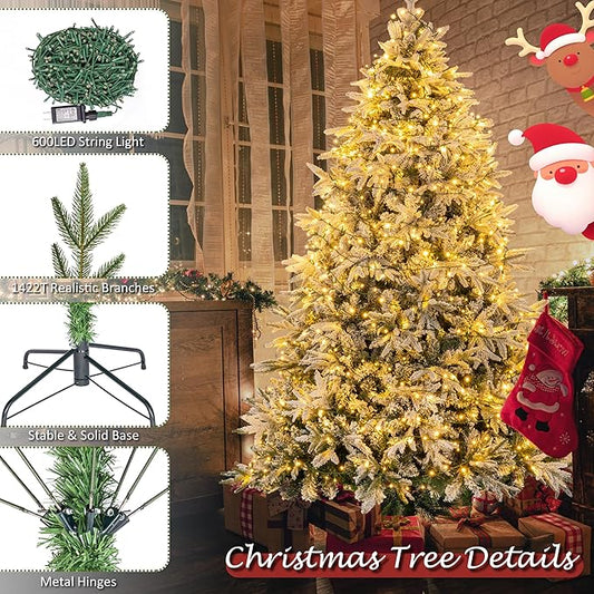 Sunnyglade 7.5ft Artificial Snow Flocked Christmas Tree with 600 LED Lights (Not pre-lit), Xmas Tree Full Tree with 1422 Branch Tips & 11 Modes Light, RGB & Warm White Light, Foldable Stand for Home