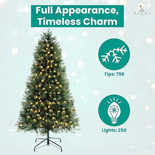 Natalie 6ft Pre-Lit Spruce Artificial Christmas Tree –Hinged PVC Branches, 798 Tips, 250 Warm White Lights, Sturdy for Ornaments, Holiday Décor w/Stable Base