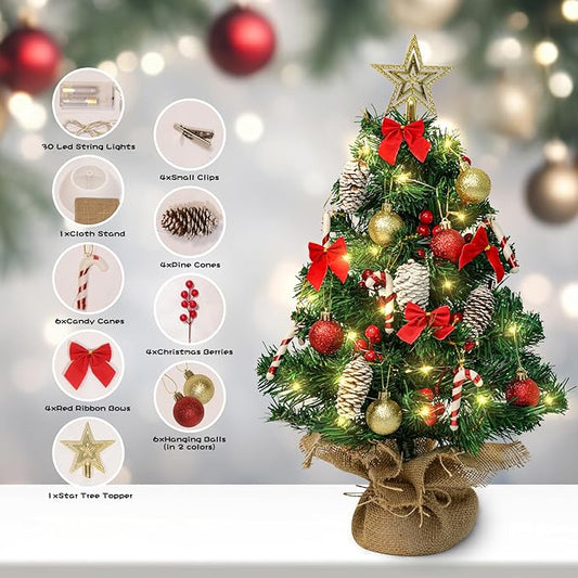 24 Inch Mini Artificial Christmas Tree with LED String Lights, Star Topper and Hanging Ornaments - Tabletop Christmas Tree for Holiday DIY Decorations