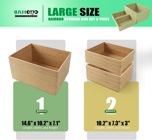 3-Piece Large Bamboo Storage Box Set, 3.1 in High Stackable Deep-Drawer Organizer for Kitchen Cutlery, Cookware, Utensils & Knives, Exquisite Durable Lidless Wooden Bin (14.6"x10.2"*1+10.2"x7.3"*2)