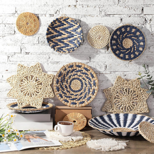 15 Pcs Boho Wall Basket Decor Woven Rattan Seagrass Wall Decor Hanging Rustic Farmhouse Western Art Decoration for Nursery Living Room Bedroom Home Kitchen(Blue Style)