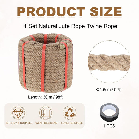 MECCANIXITY Jute Rope 0.6 Inch x 98ft, Thick Twine Rope Ropes Braided Jute Twine Natural Brown Burlap Cord String Heavy Twisted with Tape for Decorative Crafts Railing Swing Tug of War