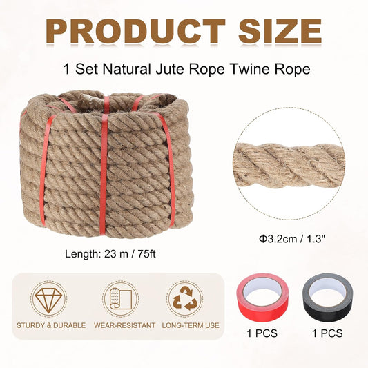 MECCANIXITY Jute Rope 1.3 Inch x 75ft, Thick Twine Rope Ropes Braided Jute Twine Natural Brown Burlap Cord String Heavy Twisted with Tapes for Decorative Crafts Railing Swing Tug of War