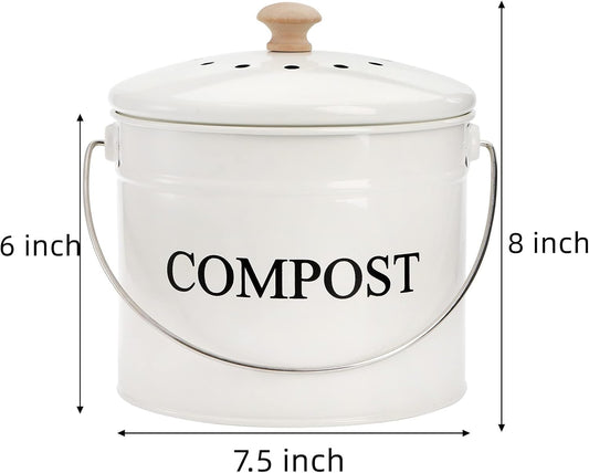 AVLA Compost Bin Kitchen Countertop, 1 Gallon Composter Pail, Food Waste Composting Bucket, Odorless Trash Keeper Container, White Scraps Caddy with Charcoal Filter, Carrying Handle, Lid
