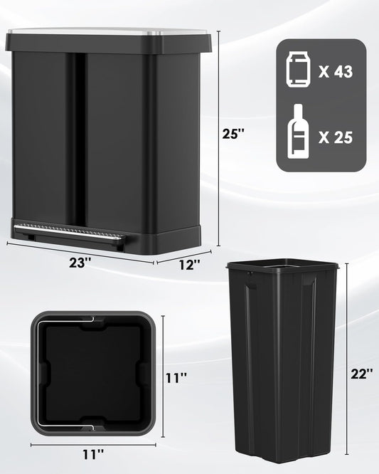 Arlopu 16 Gallon Dual Trash Can, 60L(2x30L) Stainless Steel Kitchen Garbage Can, Step-on Classified Recycle Garbage Bin with Removable Inner Buckets, for Kitchen, Living Room, Office (Black)