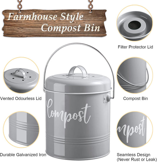 Gray Compost Bin Kitchen, 1.3 Gallon Farmhouse Kitchen Compost Bin Countertop with Lid and Charcoal Filters, Indoor Compost Bucket for Decor and Accessories