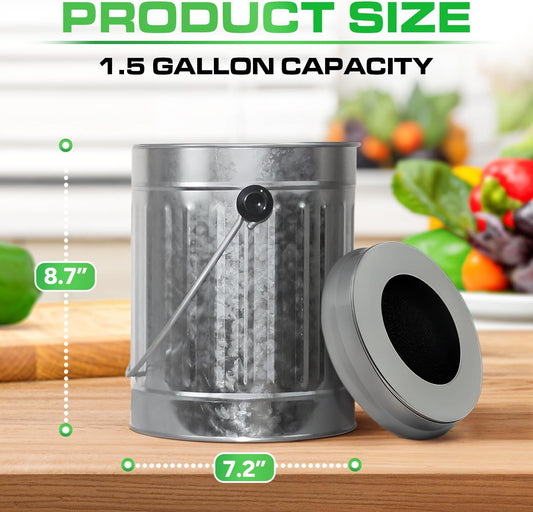 Plexon Countertop Compost Bin Kitchen Indoor, with Lid, Silver 1.5 Gallon Odorless Kitchen Compost Container, Steel Food Bucket Pail with Charcoal Filter, Silver