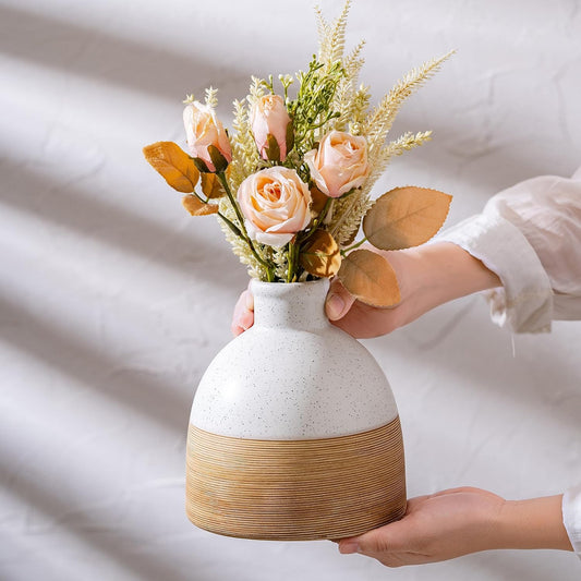Rustic Farmhouse Flower Ceramic Striped Vase, White and Brown Decorative Ceramic Modern Floral Vase for Bouquet, Cottage Home Core Decor, Tabletop Bedroom Office Bookshelf Living Room Wedding 7.7 Inch