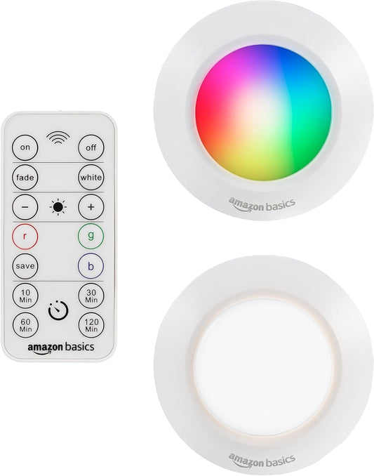 Amazon Basics LED Puck Lights, Color Changing, Battery Operated, IR Remote, 40 Lumens, 2 Pack, Wireless Stick on Lights, Under Cabinet Lighting, Ideal for Closets, and More, White