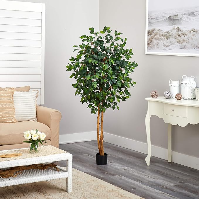 Nearly Natural 5ft Triple Trunk Artificial Ficus Tree with Natural Wood Trunks, Fake Tree for Indoor Home Décor, Faux Ficus Tree with Black Nursery Pot
