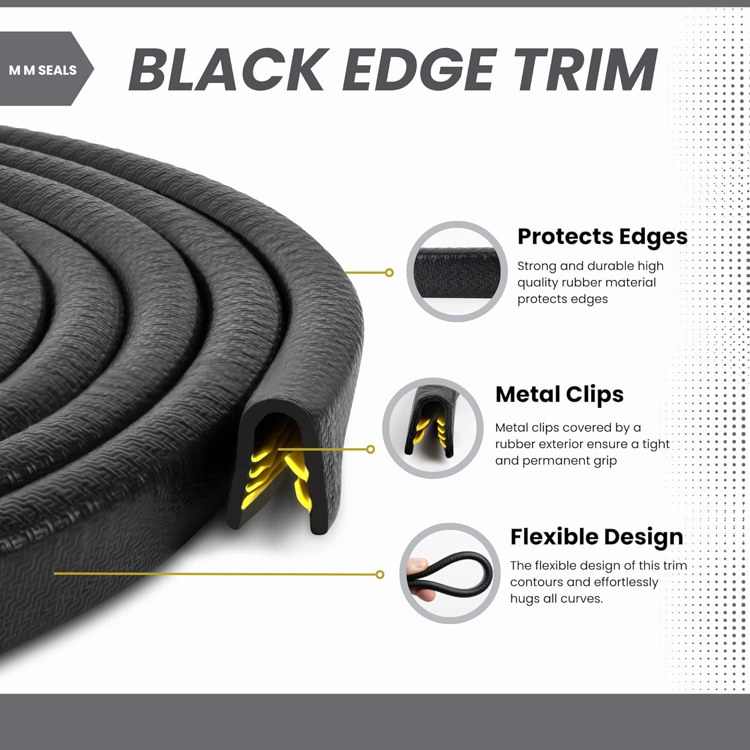 - HIGH-QUALITY MAKE & MATERIALS: At M M SEALS we use high-quality materials and are proud of our strong manufacturing process. With the special U-shaped grip on this premium material, you’ll get a long-lasting protective black edge for sharp metal edges, keeping your vehicles in top form.