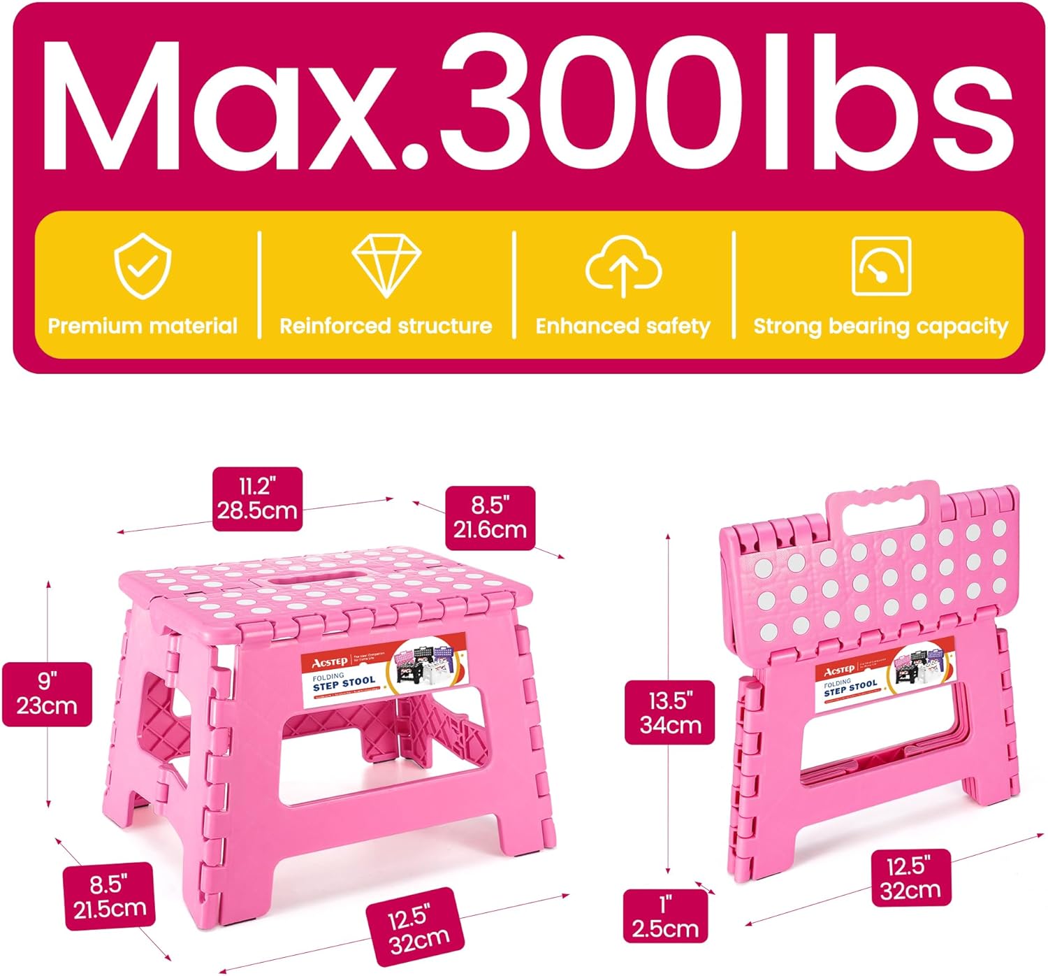 - SQUASH and ROUND CORNER PROTECTION FEATURE - ACSTEP have designed a safety gap that allows the foldable stool to prevent being squashed. Four round corners protect your body from clashing. All of this design is put your safety first.