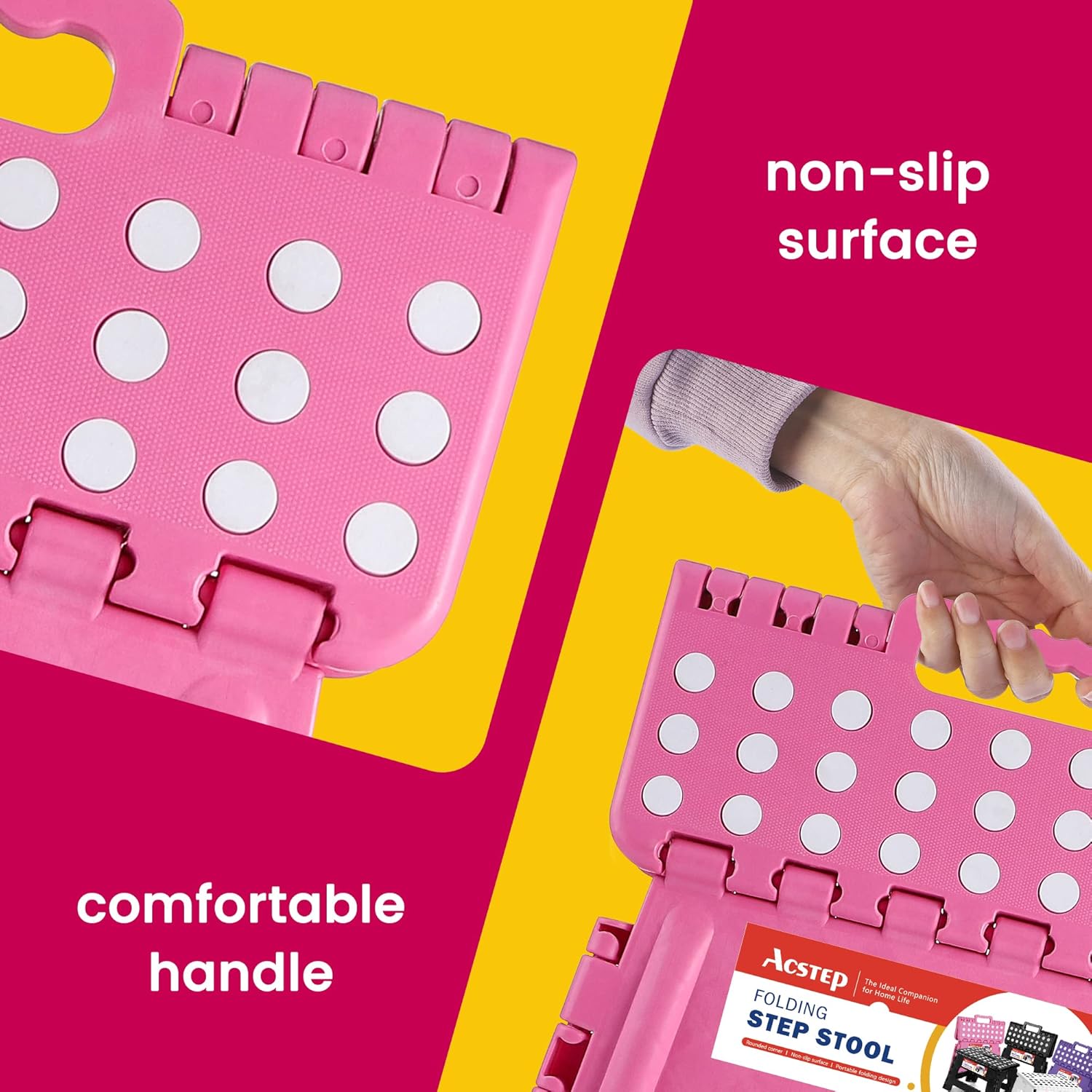 ACSTEP Folding Step Stool for Adults-11 Height Lightweight Plastic Stepping Stool. Foldable Step Stool Hold up to 300lbs Non Slip Collapsible Stool Pink