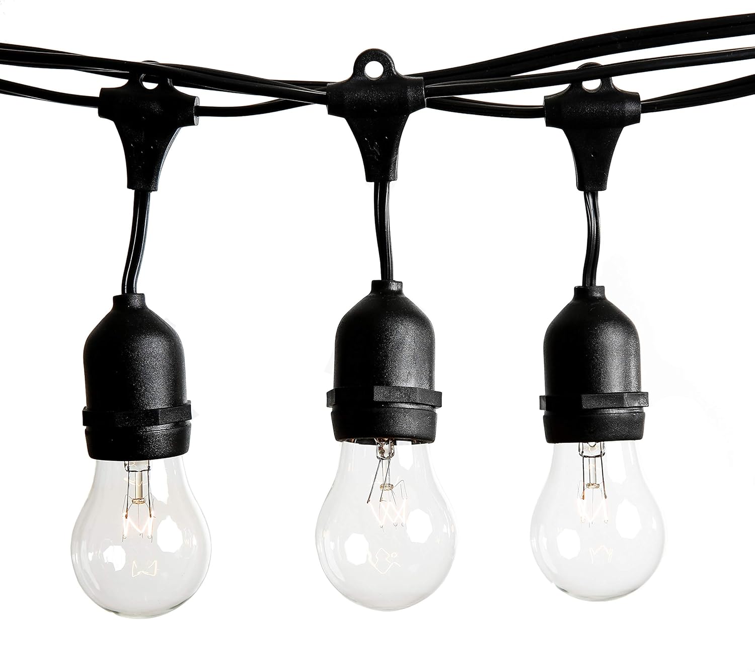 - This outdoor patio string lights set includes one commercial grade 100 foot black suspended socket outdoor light string and 50 A15 Clear glass light bulbs.