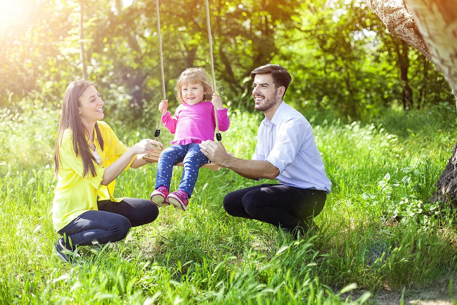 - EASY INSTALL:The tree swing no hardware tools required to install this swing sets,very easy install!First,choose the branches of a sturdy hardwood tree - oaks are ideal! Avoid fruit trees,evergreens,or trees that split easily.Then,tie the rope or the straps in the hanging kit around the tree branch and adjust to your desired angle,done! Such a great fun to your backyard !
