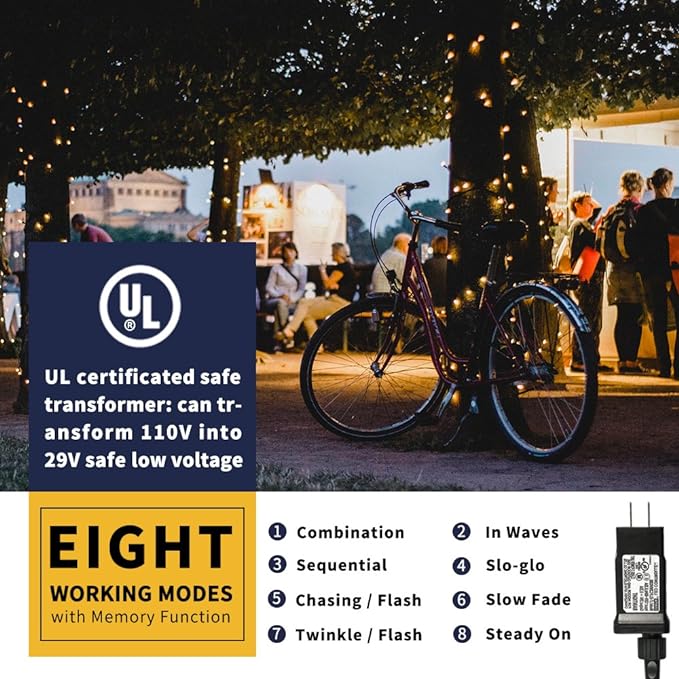 - 29V Low Voltage and UL Certified, Safe to Use:New generation 29V low voltage transformer and whole set string lights including string wire, LED bulbs and plug have been certified by UL to ensure & maximize the safety. Meets UL588 standard for safety of Holiday/seasonal decorative light, much safe to use. Perfect for Christmas, halloween, Easter, weddings, party, festival, holiday decoration.