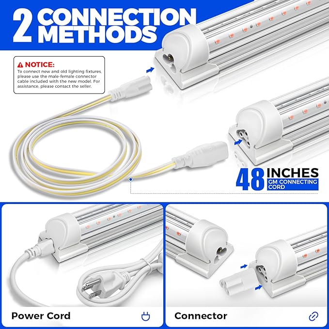 - Easy Installation: These LED grow light strips are just plug in and light up. With included tapes, clips and cable ties, you could set up in different ways to meet your application. And you can link up to 10 grow lights in one series by 48 inches connecting cords or short connectors