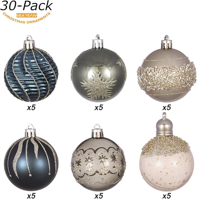 Sea Team 60mm/2.36" Delicate Contrast Color Theme Painting & Glittering Christmas Tree Pendants Decorative Hanging Christmas Baubles Balls Ornaments Set - (Stone Blue & Silver Grey), Pack of 30