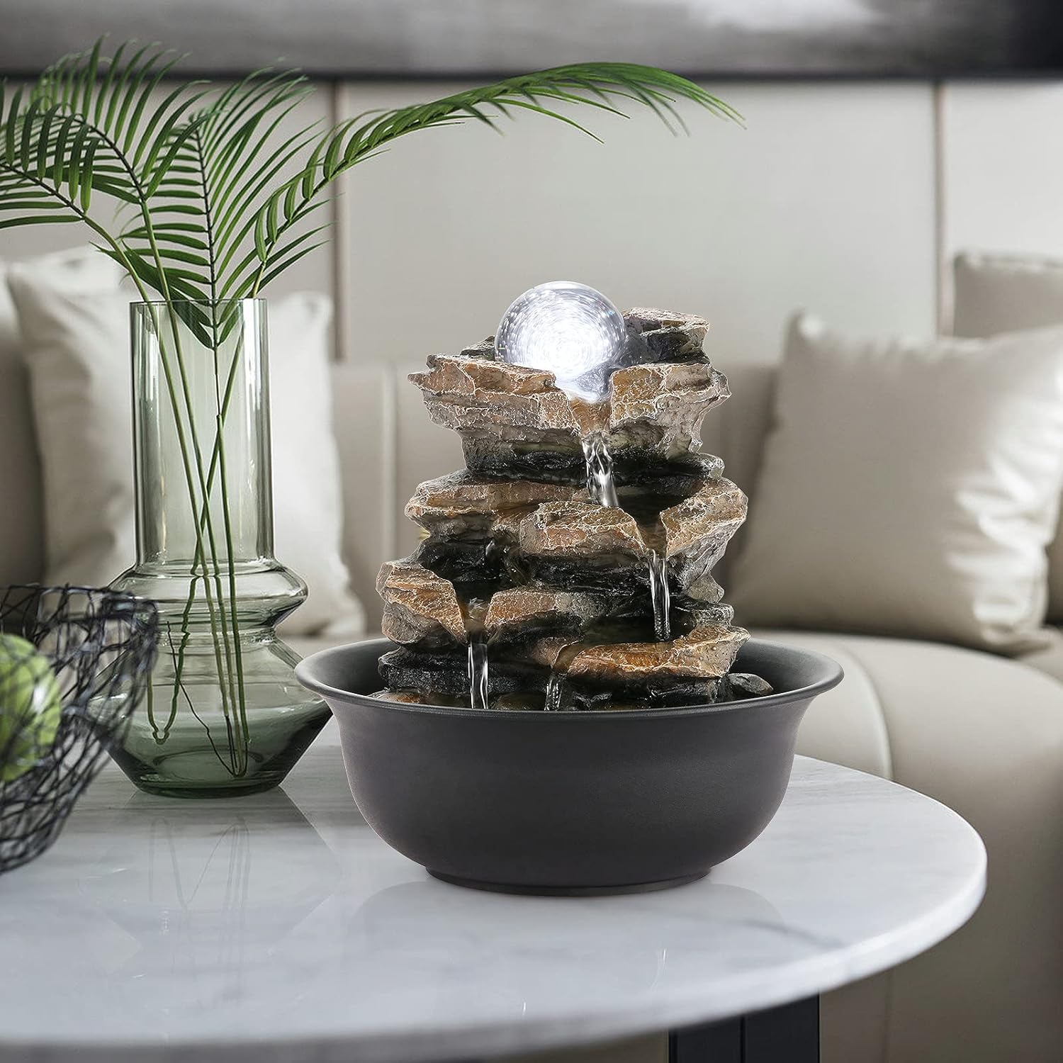 - Built-in LED Light: The rolling ball of fountain is lit by the LED lighting to offer a peaceful, calming glow. Crystal-like orb spins as water cascades down water tiers of stone-like layers creating a calming ambiance. Give your home or office a touch of style and serenity with this indoor water feature.