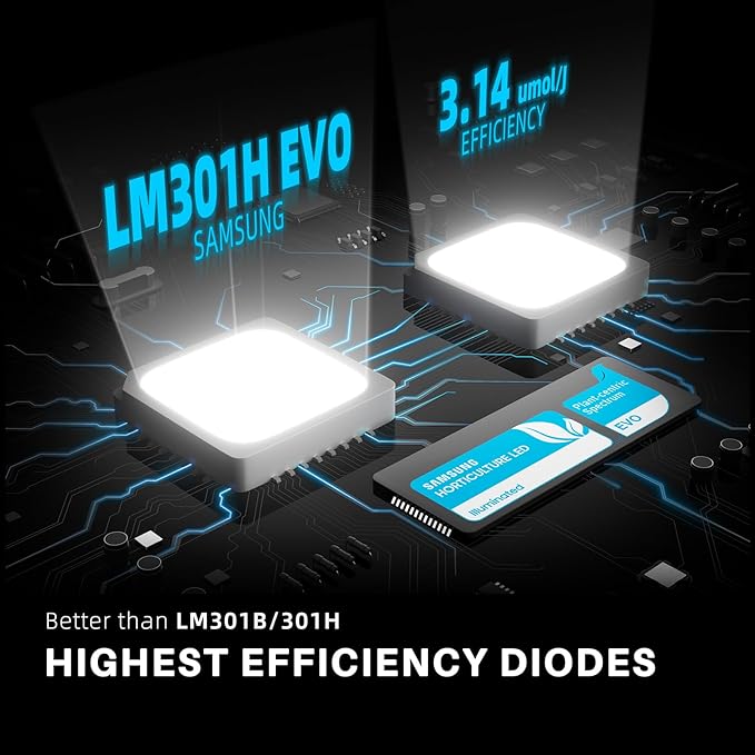 - Cutting-Edge LED Chips for Unrivaled Performance:Introducing the Samsung LM301H EVO LEDs. Boasting an impressive efficiency rating of 3.14 µmol/J PPE per diode , these LEDs outshine even the renowned LM301B, LM301H, and Bridgelux 3030 chips in terms of sheer effectiveness, no fan, completely silent. EVO LEDs redefine plant growth enhancement. With superior light quality and an increased light output per LED, they harness a more potent blue spectrum.