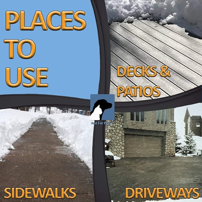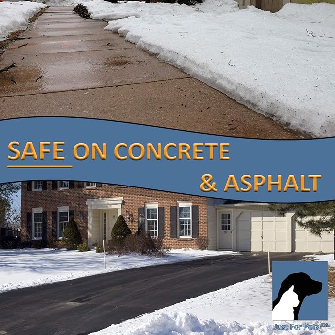 JUST FOR PETS Snow & Ice Melter Safe for Pets & Paws Contains No Toxic Chlorides or Painful to The Paw Rock Salt, Safe for Dogs & Cats. Fast Acting and Works On Contact 9 lb. Shaker Jug