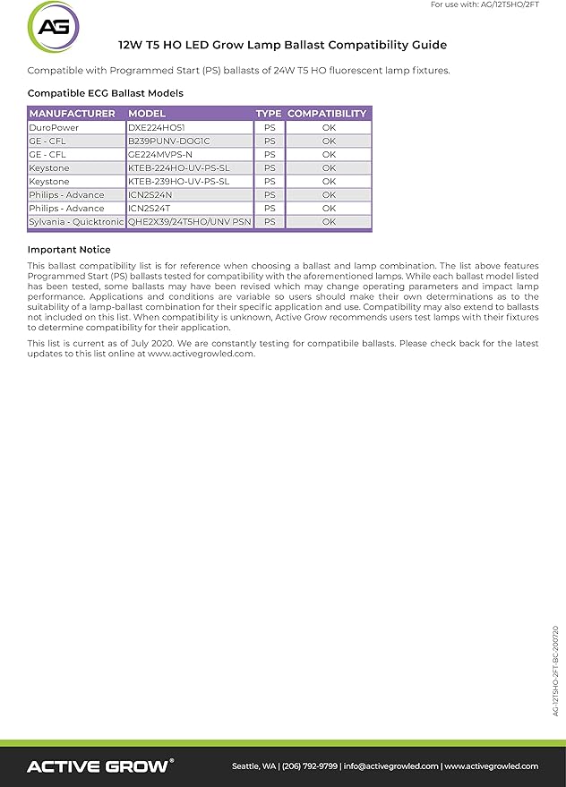 - Plug and play T5 LED bulb compatible with Hydrofarm, Agrobrite and other major T5 grow light fixtures. CHECK BALLAST COMPATIBILITY LIST IN PRODUCT IMAGES. NOT FOR USE WITH SINGLE UNIT T5 FIXTURES.