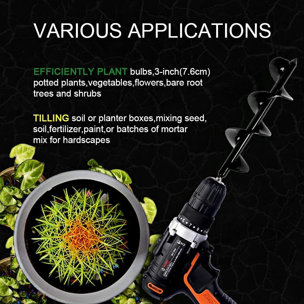 - VARIOUS APPLICATIONS: This spiral hole drill is the professional landscapers’ choice for dramatically increased efficiency when planting bulbs, potted plants, vegetables, flowers, bare root trees and shrubs, tilling soil or planter boxes, mixing seed, soil,paint,or batches of mortar mix.Simplify drilling tasks such as digging weeds roots, taking soil samples, boring plant holes or erecting fences