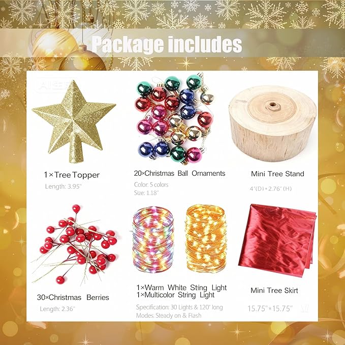 - Package Includes-The Xmas Tabletop Tree's size is 24 Inch, containing 30 red berries,20 colorful Christmas ball ornaments,a golden treetop star and 2 LED light strings (1 x warm white,1 x colorful)