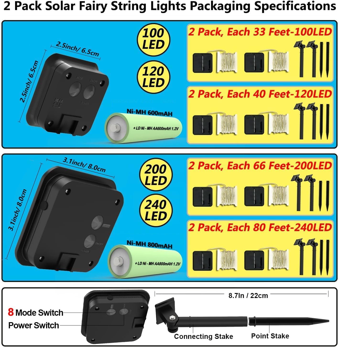 - | Upgraded Larger Panels! | - Our solar fairy lights equipped with 2 premium silicon solar panels and inbuilt rechargeable batteries (33ft&40ft Upgraded 2.5*2.5 inch solar panels 600mAh battery) (66ft&80ft Upgraded 3.1*3.1 inch solar panels 800mAh battery) , 8hrs auto-charging at daytime, providing twinkle shining lights above 10hrs in night!