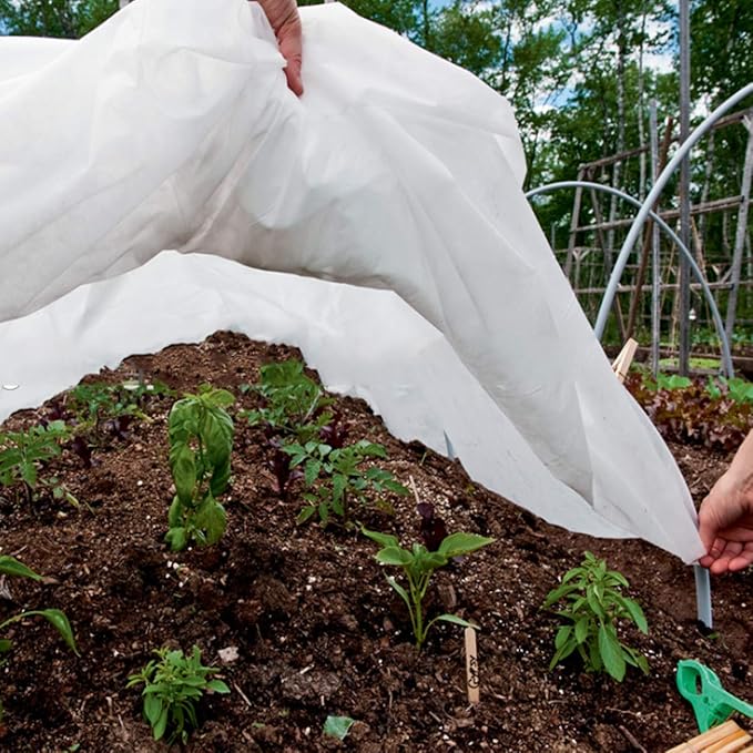 - 【All-Purpose Garden Plant Cover】Faraer Floating Row Cover is a polypropylene garden covers that transmits 70 percent of available light. It keeps heat in, bugs out, and is an excellent windbreak for young transplants. It allows rain and overhead irrigation to reach plants and soil. Secure with ground stakes (sold separately).