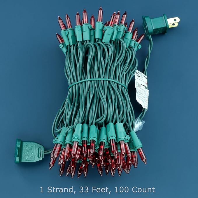 - Specifications: 33' total length of green wire with 100 red glass bulbs, 4" spacing, 4" lead, 4" tail. With a tangle-free design, external lamp lock, and commercial grade 22 AWG wire with a pure copper core, installation is swift and professional. Indoor and outdoor use.