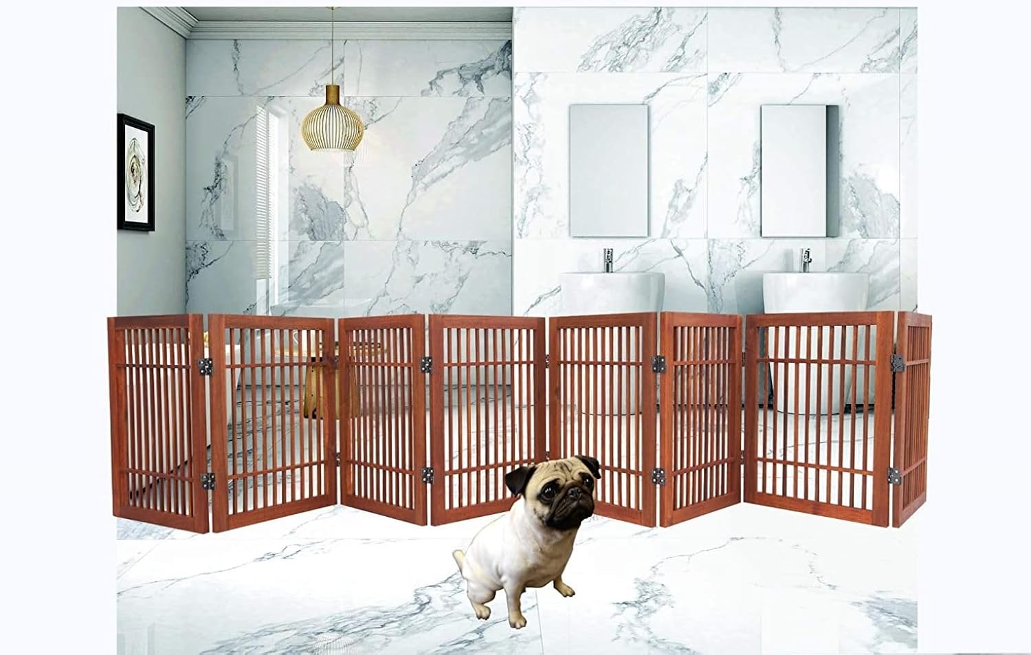 - This pet gate is primarily used in large openings and doorways to keep pets out of certain areas of the home. It is a strong and durable as well as an attractive home décor pet product. Urnporium Freestanding folding wooden pet gates are flexible solutions for controlling pet movement in your home, enabling you to block off specific areas without permanent installation. Their portable design allows for easy repositioning to create a safe space for your pet or protect your furniture from inquisitive paws. Plus, their appealing wooden design can complement your home’s decor while serving as a practical barrier for your dogs.