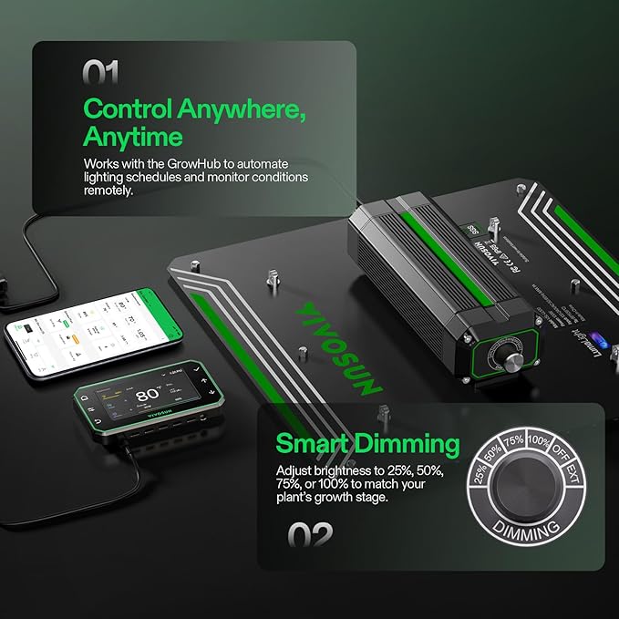 - Control Anywhere with Smart Dimming: Compatible with the Vivosun GrowHub (sold separately) and mobile app to automate lighting schedules and monitor remotely; Adjust light intensity via the 4-level dimming knob from 25% to 100% to match plant needs