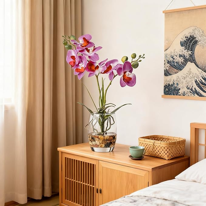 - Realistic Purple Orchid in Glass Vase: These artificial orchids feature detailed purple petals with complementary foliage in a glass vase accented with stones. The artificial flowers with vase create a sophisticated orchid display that enhances any interior space.
