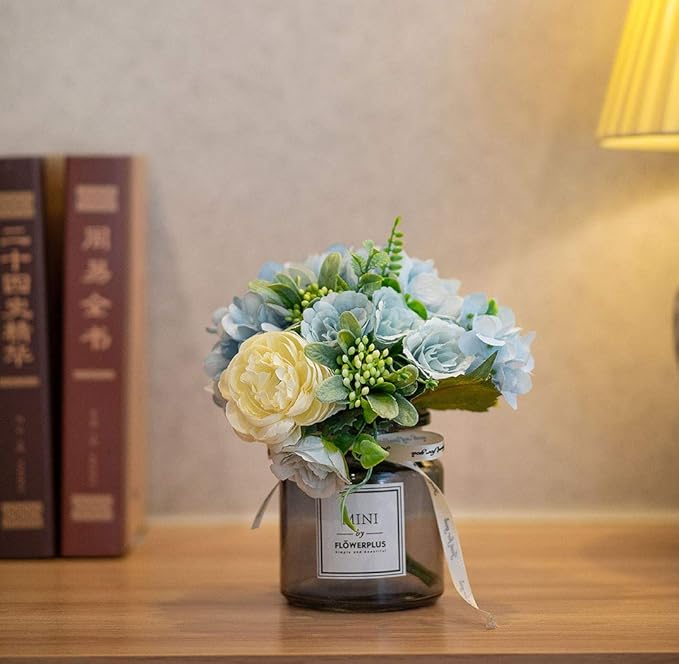 Artificial Flowers with Vase, Hydrangea Hand Bouquet and vase, Ins Style Artificial Flower Set, Suitable for Living Room, Dining Table, Office, Wedding, Hotel Banquet Home Decoration. (Blue)