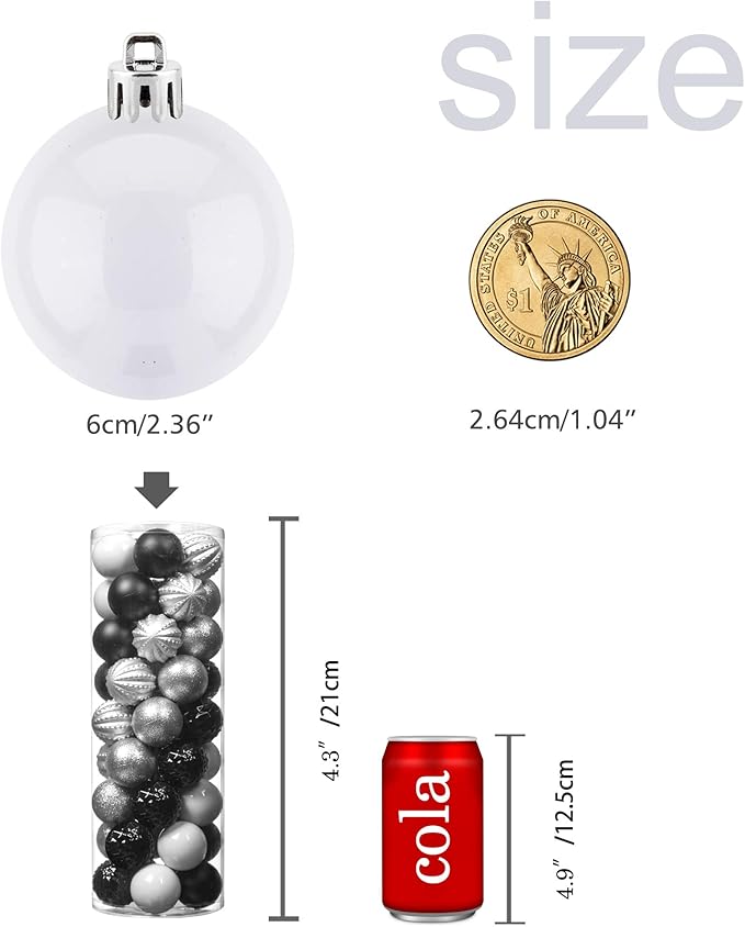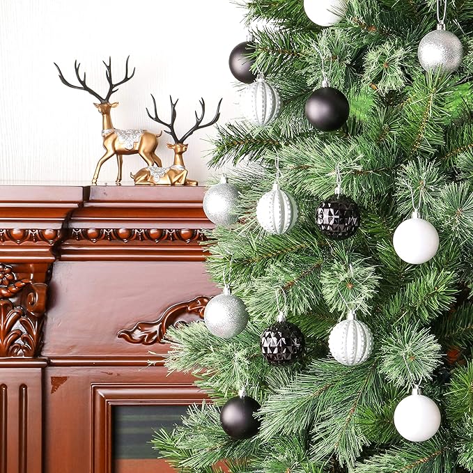 45Pcs 6cm Christmas Glitter Ball Ornaments, Shatterproof Plastic Xmas Tree Decorations for Holidays, Weddings, Parties - Black, White, Silver