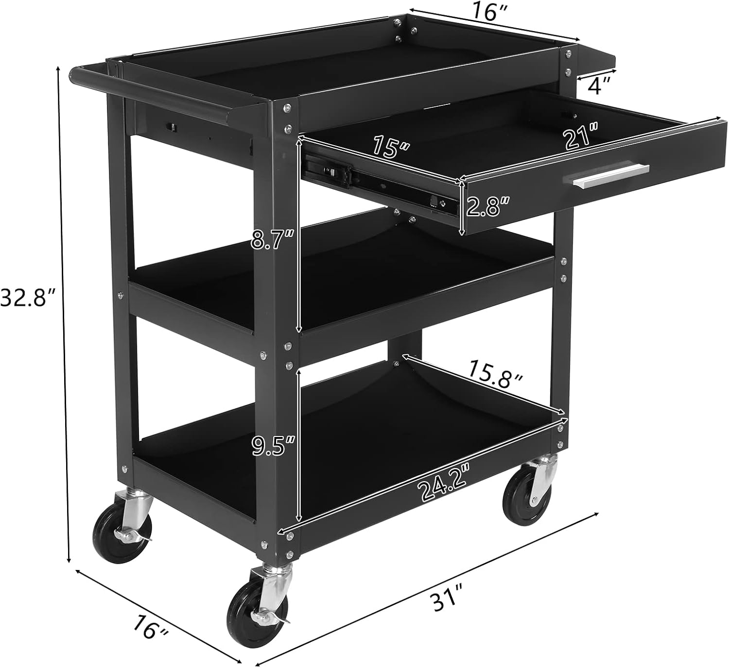 - 【Spacious Storage Capacity】 3-tier utility cart provides large storage space while saving your floor space; Moreover, it featured with a sliding drawer with a convenient plug for better tool management! Great storage solution for your warehouse