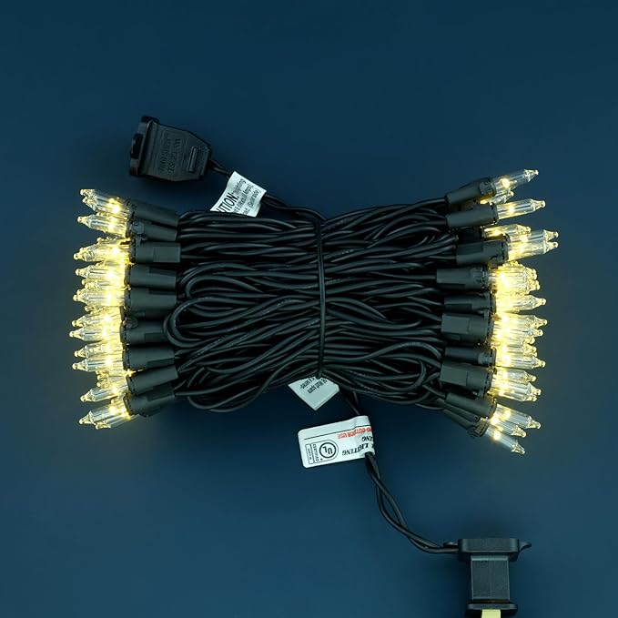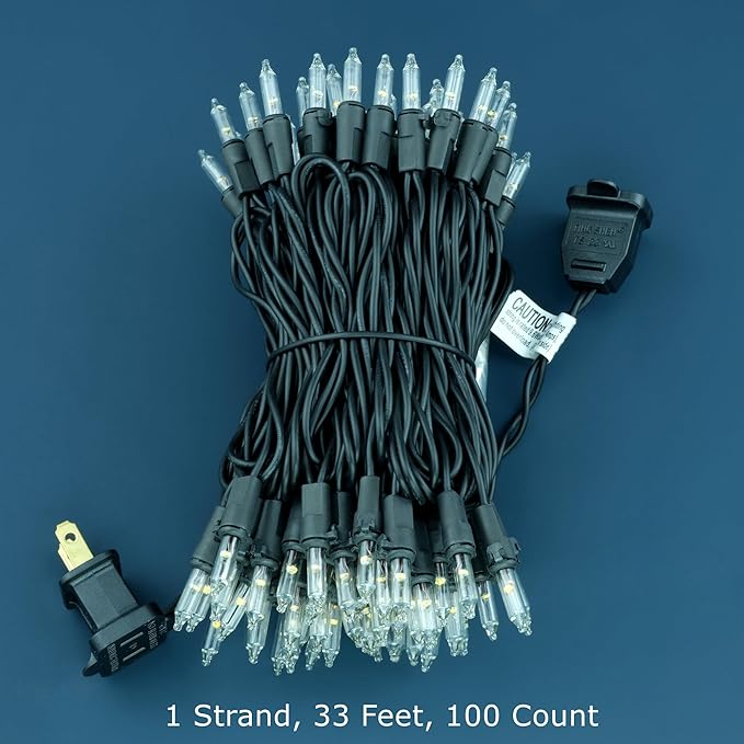 - Specifications: 33' total length of black wire, 100 warm white bulb similar to clear incandescent bulb, 4" spacing, 4" lead, 4" tail. With a tangle-free design, external lamp lock, and commercial grade 22 AWG wire with a pure copper core, installation is swift and professional. Indoor and outdoor use.