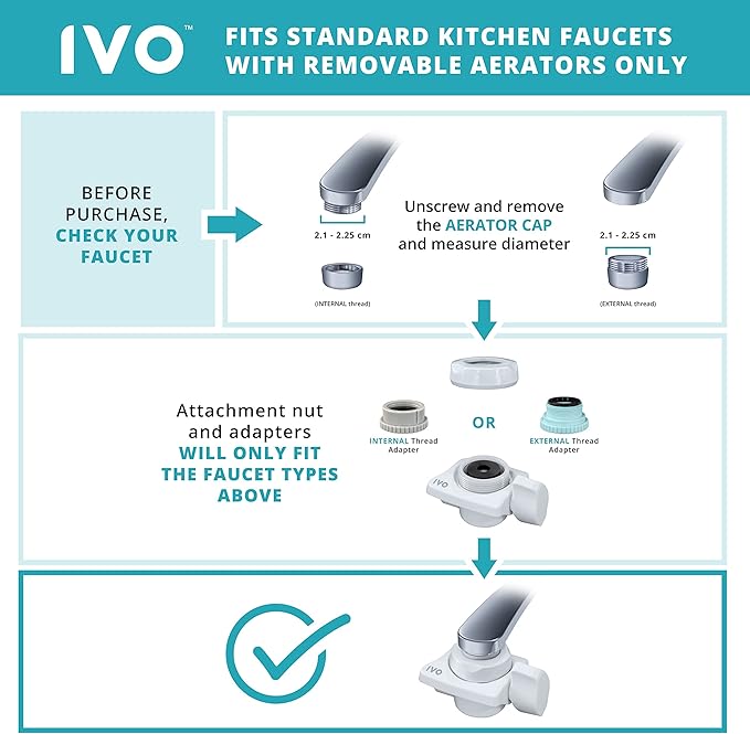- IMPORTANT INFORMATION: - This product fits standard kitchen faucets with removeable aerators only. Please check the images for the exact size and incompatible faucet types to make sure this is right for you. - This product is not designed to remove TDS. Minerals are what show up in TDS/PPM Tests. There will be no change in TDS/PPM readings as IVO retains beneficial minerals in tap water.