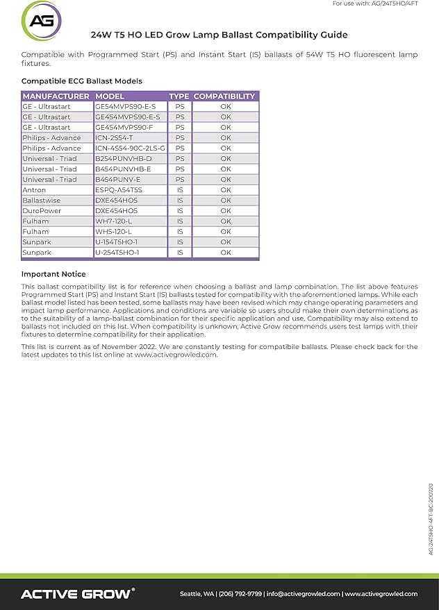 - Plug and play T5 LED bulb compatible with Hydrofarm, Agrobrite and other major T5 grow light fixtures. CHECK BALLAST COMPATIBILITY LIST IN PRODUCT IMAGES. NOT FOR USE WITH SINGLE UNIT T5 FIXTURES.